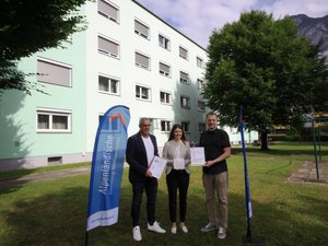 Am Mittwoch, den 22. Juni 2022 durfte DI Laszlo Lepp vom Passivhaus Institut aus Innsbruck, Geschäftführerin Mag.(FH) Cornelia Springer von der Alpenländische Gemeinnützige WohnbauGmbH das EnerPHit-Vorzertifikat für das sanierte Objekt in der Wolkensteinstraße in Völs in Tirol übergeben.